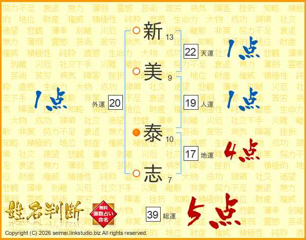 あなたの人生を表す1番重要な運勢です。生涯を通じて影響する総合運となり、主に50歳以降の晩年期に影響を及ぼします。苗字と名前の合計画数。