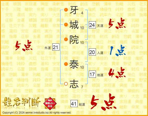 牙(4画)城(10画)院(10画) 泰(10画)志(7画)