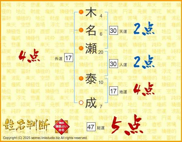 木(4画)名(6画)瀬(20画) 泰(10画)成(7画)