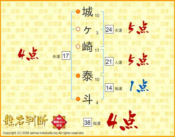 城(10画)ヶ(3画)崎(11画) 泰(10画)斗(4画)