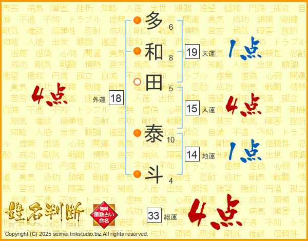 生活面を象徴する運勢です。外部から受ける影響力を表し、結婚運、家庭運や職場、環境への順応性を表します。総運から人運を引いた画数。姓や名が1文字の場合を除く。