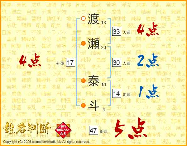 渡(13画)瀬(20画) 泰(10画)斗(4画)