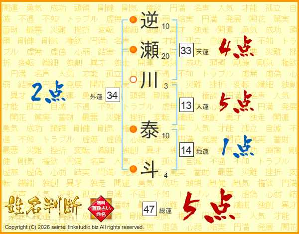 逆(10画)瀬(20画)川(3画) 泰(10画)斗(4画)