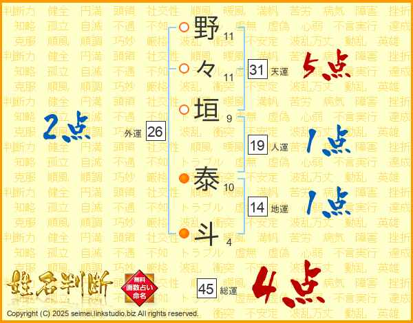 野(11画)々(11画)垣(9画) 泰(10画)斗(4画)