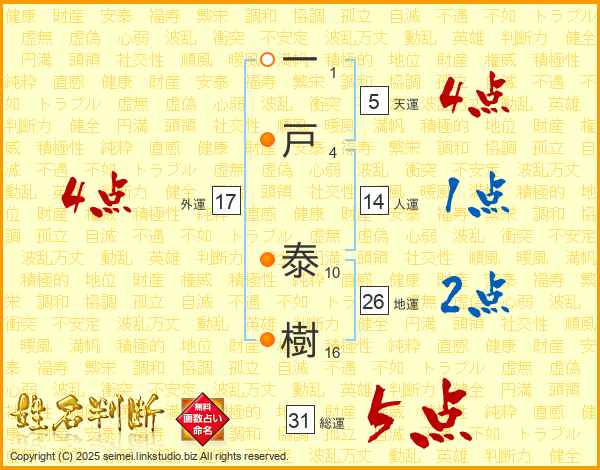 一(1画)戸(4画) 泰(10画)樹(16画)