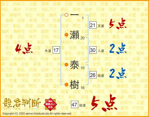 一(1画)瀬(20画) 泰(10画)樹(16画)