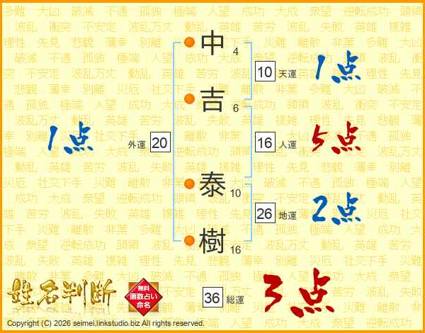 中(4画)吉(6画) 泰(10画)樹(16画)