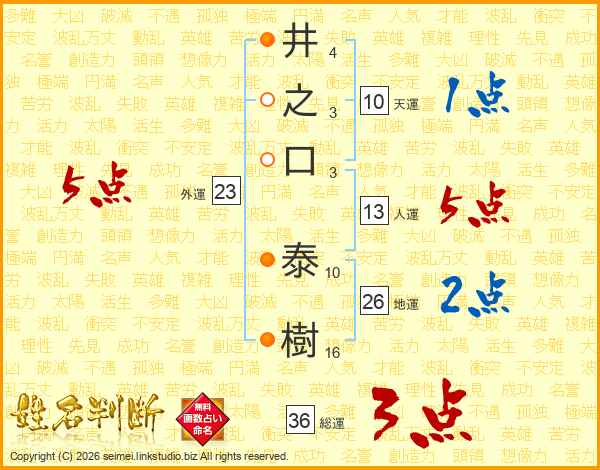 井(4画)之(3画)口(3画) 泰(10画)樹(16画)