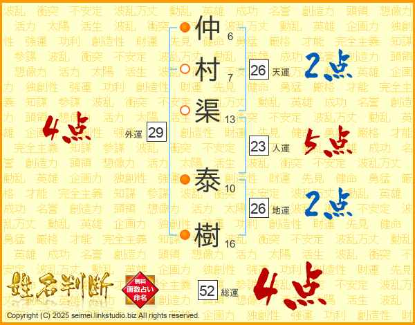 仲(6画)村(7画)渠(13画) 泰(10画)樹(16画)