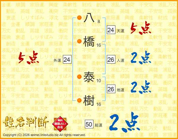 八(8画)橋(16画) 泰(10画)樹(16画)