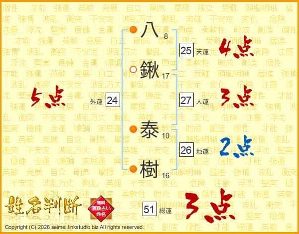 八(8画)鍬(17画) 泰(10画)樹(16画)