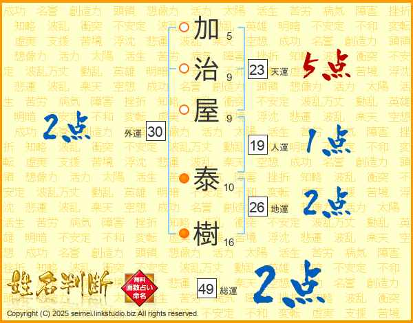加(5画)治(9画)屋(9画) 泰(10画)樹(16画)