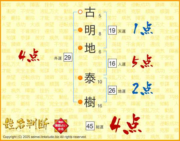 古(5画)明(8画)地(6画) 泰(10画)樹(16画)