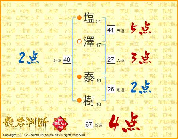 塩(24画)澤(17画) 泰(10画)樹(16画)