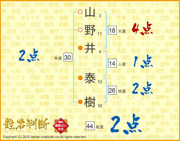 山(3画)野(11画)井(4画) 泰(10画)樹(16画)