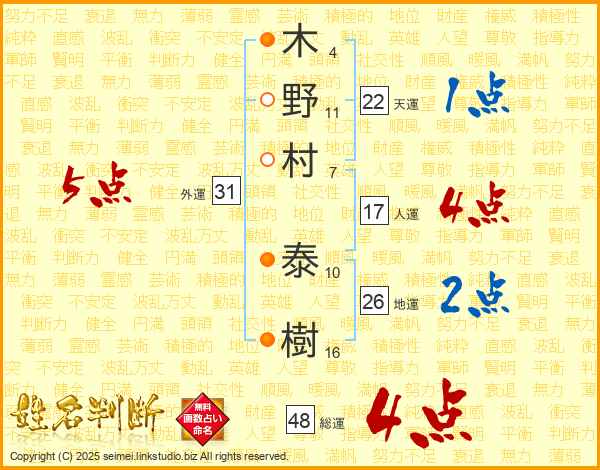 木(4画)野(11画)村(7画) 泰(10画)樹(16画)