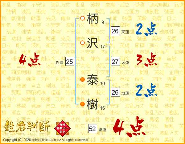 柄(9画)沢(17画) 泰(10画)樹(16画)