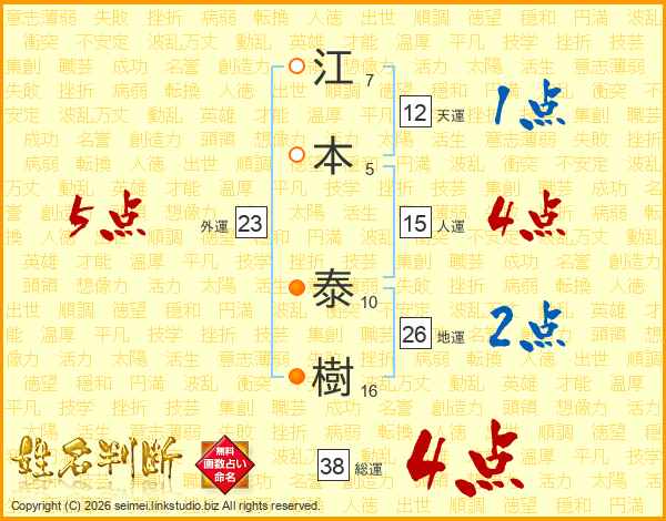 江(7画)本(5画) 泰(10画)樹(16画)