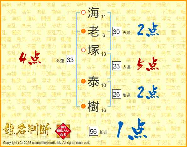 海(11画)老(6画)塚(13画) 泰(10画)樹(16画)