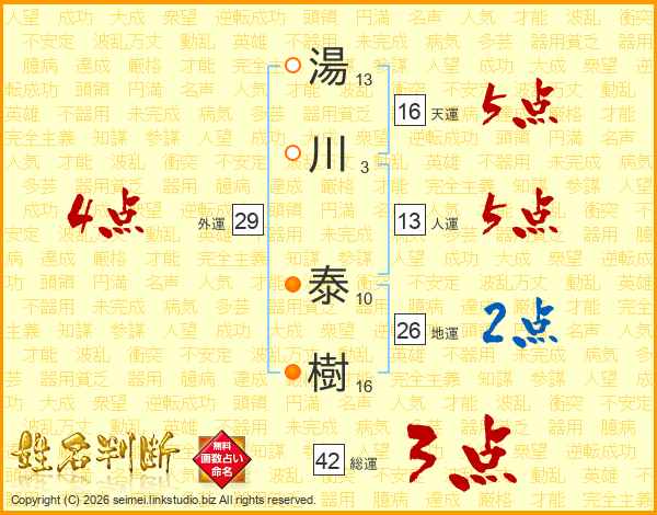 湯(13画)川(3画) 泰(10画)樹(16画)