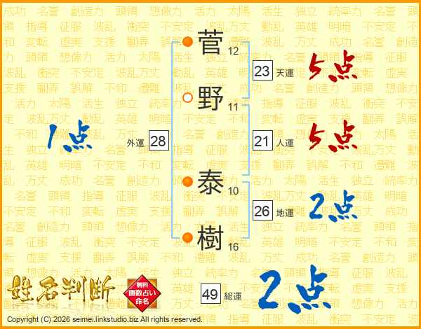 菅(12画)野(11画) 泰(10画)樹(16画)