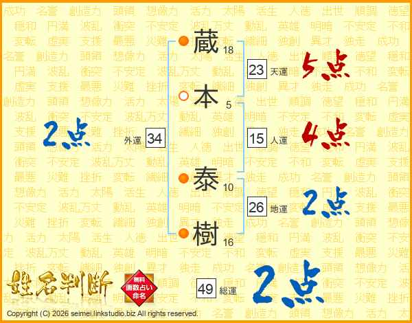 蔵(18画)本(5画) 泰(10画)樹(16画)