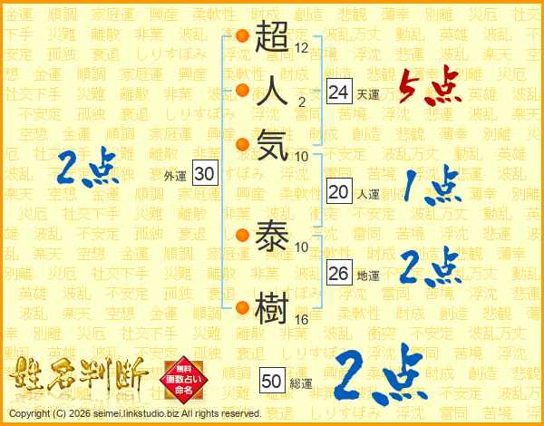 超(12画)人(2画)気(10画) 泰(10画)樹(16画)