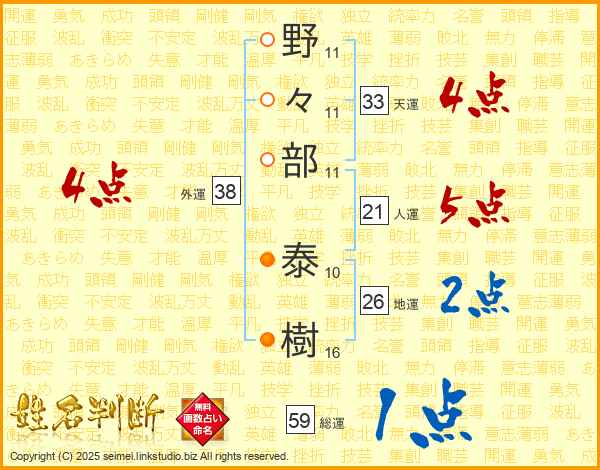 野(11画)々(11画)部(11画) 泰(10画)樹(16画)