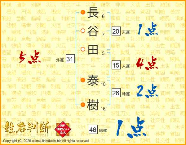 長(8画)谷(7画)田(5画) 泰(10画)樹(16画)