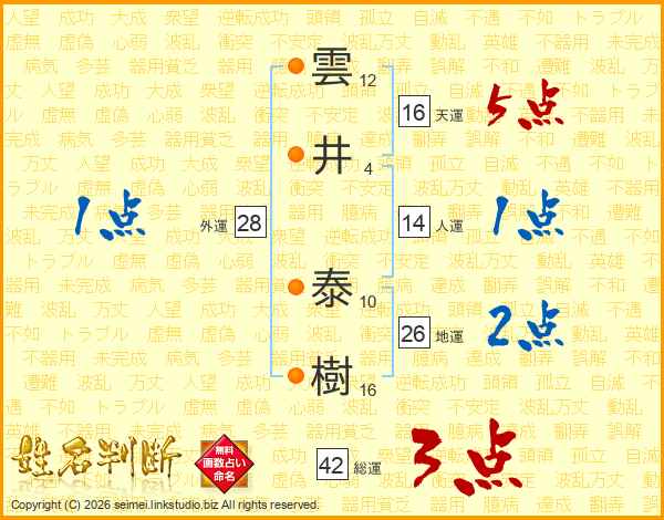 雲(12画)井(4画) 泰(10画)樹(16画)