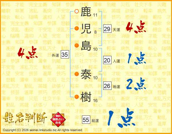 鹿児島泰樹さんの天運は29画の4点!