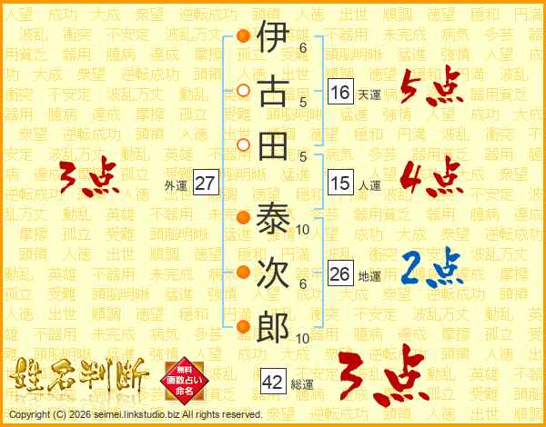 伊(6画)古(5画)田(5画) 泰(10画)次(6画)郎(10画)