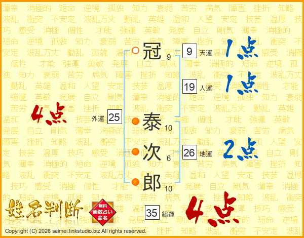 冠(9画) 泰(10画)次(6画)郎(10画)