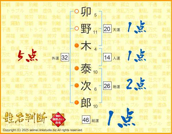 卯(5画)野(11画)木(4画) 泰(10画)次(6画)郎(10画)