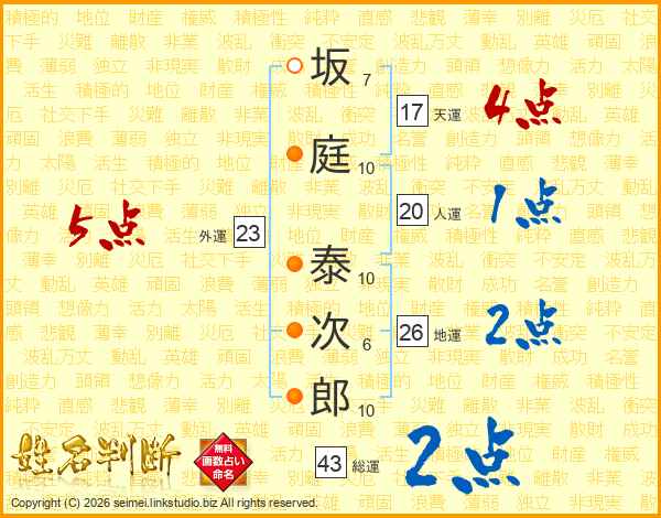 坂(7画)庭(10画) 泰(10画)次(6画)郎(10画)