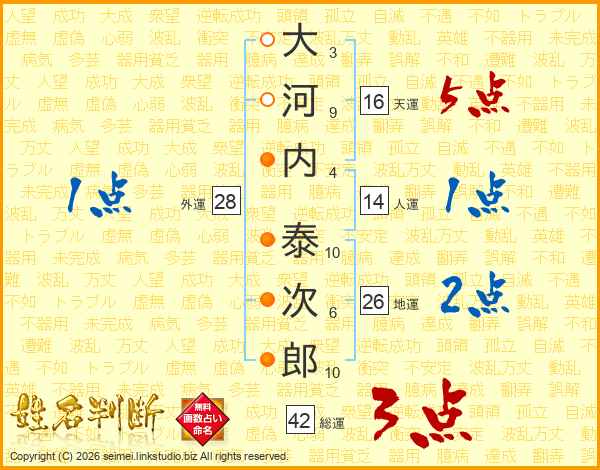 大河内泰次郎さんの地運は26画の2点!
