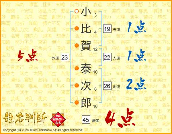 小(3画)比(4画)賀(12画) 泰(10画)次(6画)郎(10画)