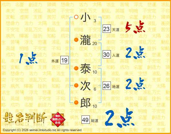 小(3画)瀧(20画) 泰(10画)次(6画)郎(10画)
