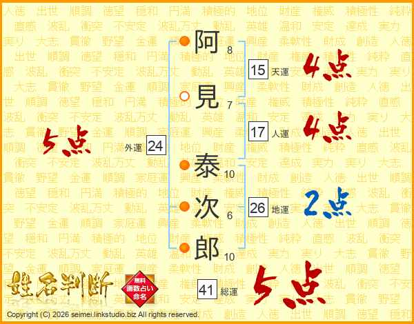 阿見泰次郎さんの総運は41画の5点!