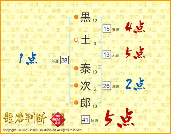 黒(12画)土(3画) 泰(10画)次(6画)郎(10画)