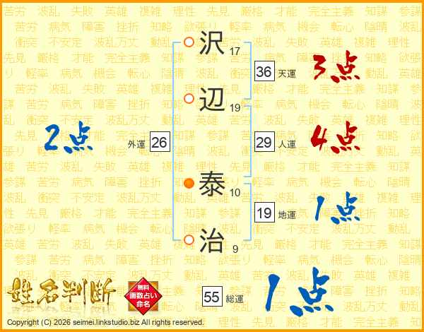 沢(17画)辺(19画) 泰(10画)治(9画)