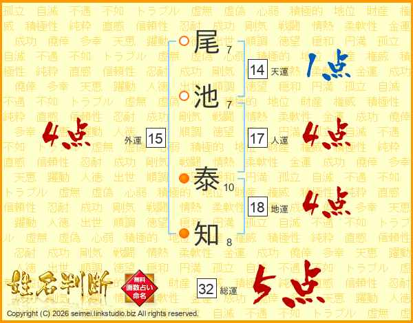 生活面を象徴する運勢です。外部から受ける影響力を表し、結婚運、家庭運や職場、環境への順応性を表します。総運から人運を引いた画数。姓や名が1文字の場合を除く。