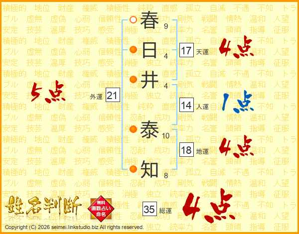 春(9画)日(4画)井(4画) 泰(10画)知(8画)