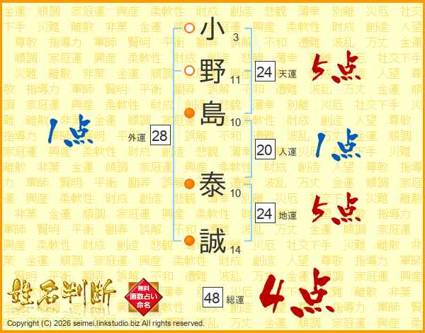 小(3画)野(11画)島(10画) 泰(10画)誠(14画)