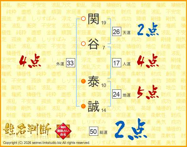 関(19画)谷(7画) 泰(10画)誠(14画)