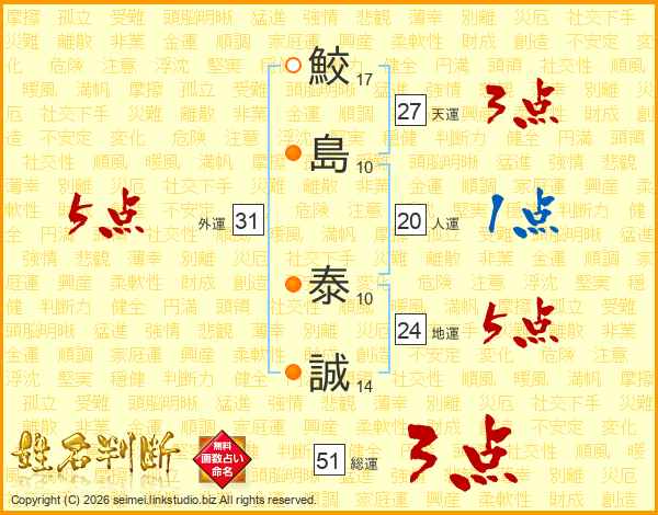 鮫(17画)島(10画) 泰(10画)誠(14画)