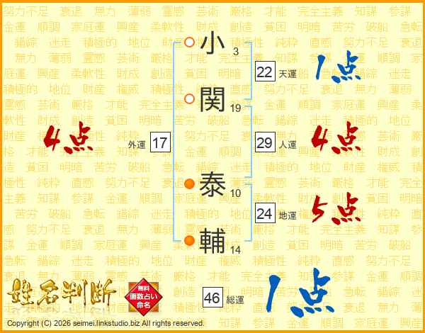 生活面を象徴する運勢です。外部から受ける影響力を表し、結婚運、家庭運や職場、環境への順応性を表します。総運から人運を引いた画数。姓や名が1文字の場合を除く。