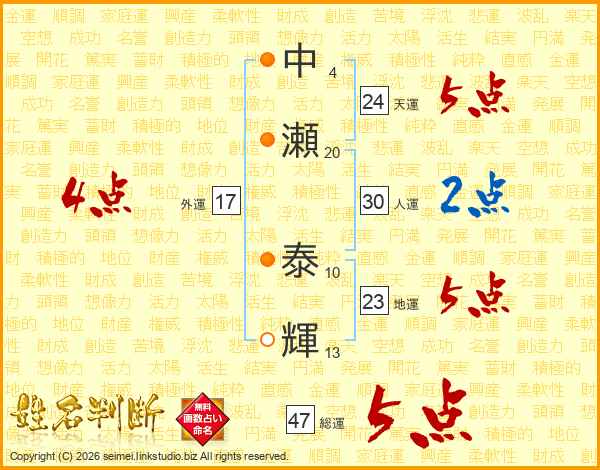 中瀬泰輝さんの総運は47画の5点!