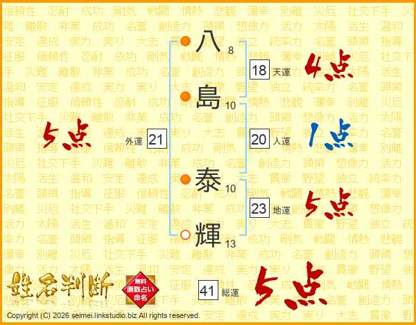 八島泰輝さんの総運は41画の5点!