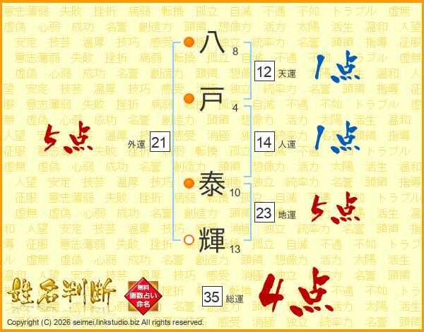 八(8画)戸(4画) 泰(10画)輝(13画)